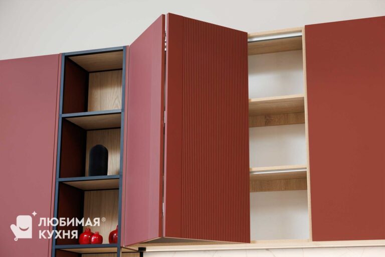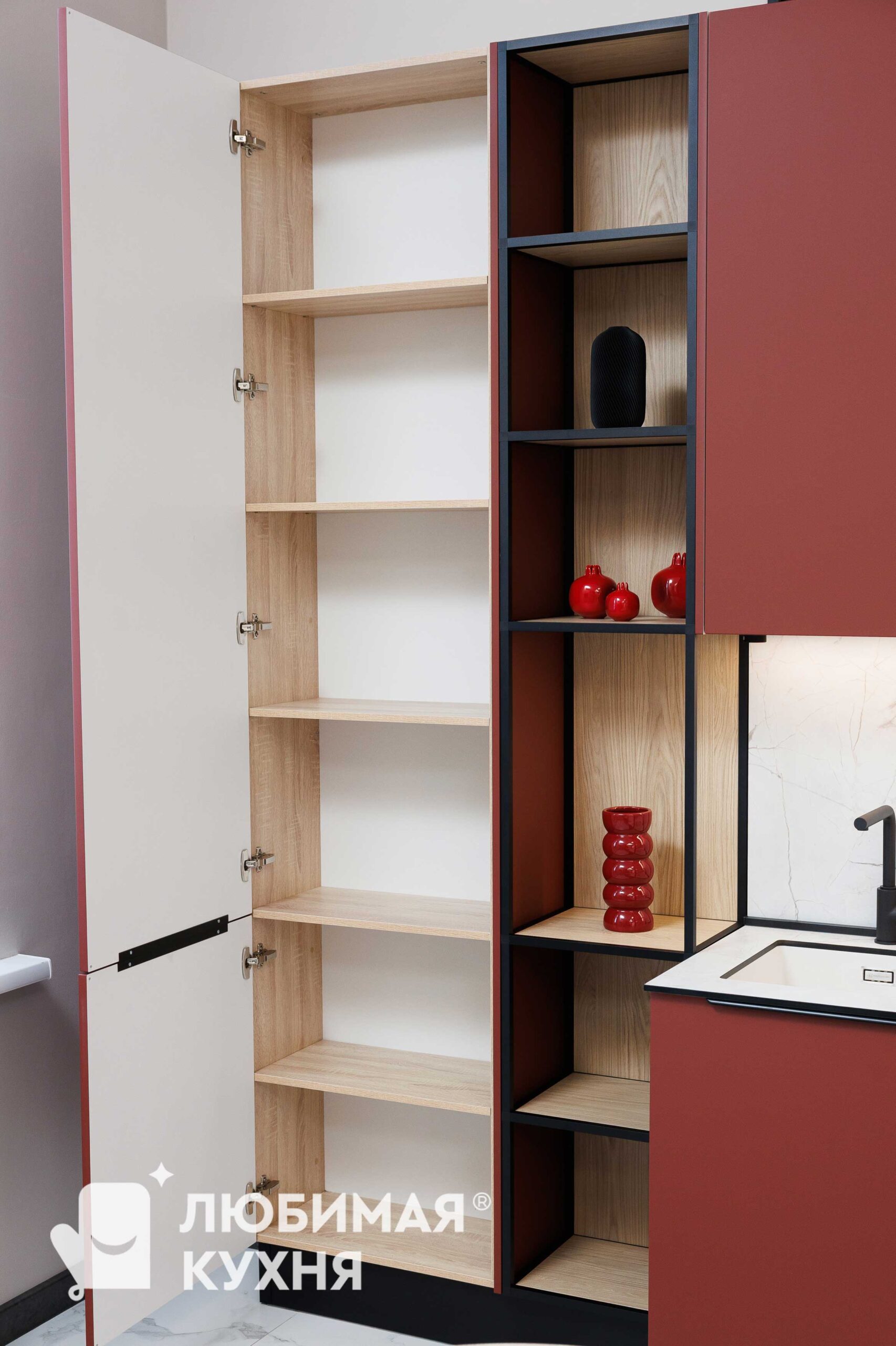 Современная кухня с контрастным сочетанием оттенка бордо и светлых деревянных фасадов. Главный акцент — высокий пенал с открытыми полками в чёрном металлическом каркасе, создающий эффект лёгкости. Фартук и столешница из белого мрамора с серыми прожилками гармонично связывают композицию. Чёрные ручки-профили, смеситель и бытовая техника подчёркивают графичность линий. Трековое освещение и минималистичный дизайн делают интерьер функциональным и стильным.