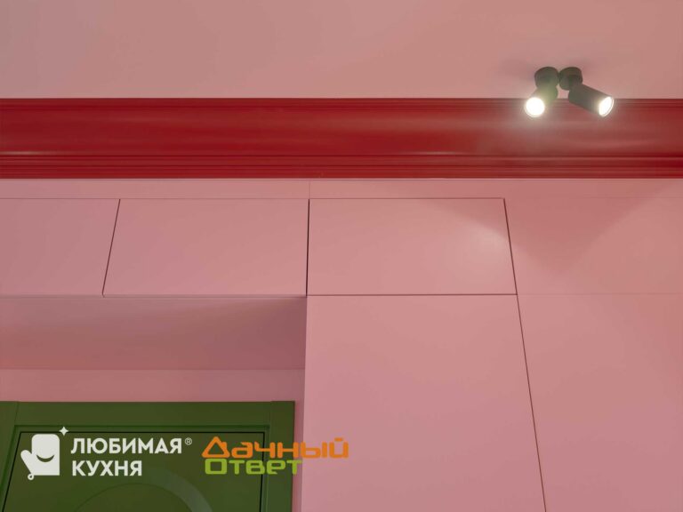 Сейчас по плану – шкаф в столовой. Он займет целиком одну из стен. Корпуса у элементов – из серой ламинированной ДСП. Фасады – в декоре Lotus–розовый. Слева – секция со стеклом.